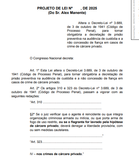 O Projeto de Lei 1074/25, apresentado pelo deputado Alex Manente (Cidadania-SP), propõe mudanças significativas no tratamento de casos de cárcere privado no Brasil. A medida determina que a prisão preventiva seja automaticamente decretada durante a audiência de custódia e proíbe a concessão de fiança aos acusados desse tipo de crime. O texto está em análise na Câmara dos Deputados.