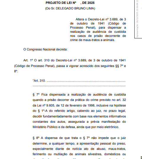 O Projeto de Lei 6484/25 propõe dispensar a realização de audiência de custódia nos casos de prisão em flagrante por crime de maus-tratos a animais. A matéria está em análise na Câmara dos Deputados.