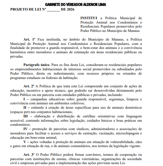 Na justificativa, o vereador afirma que a proposta apresenta ações concretas e de fácil implementação, como campanhas educativas, incentivo à criação de áreas pet e parcerias para facilitar o acesso a serviços essenciais como castração e vacinação. Ele destaca que o texto garante a inclusão de animais comunitários e daqueles que vivem nas ruas dos residenciais, ampliando o alcance das políticas públicas de proteção animal em Manaus.