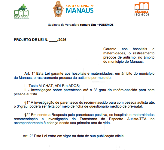 Está em tramitação na Câmara Municipal de Manaus (CMM) um projeto de lei de autoria da vereadora Yomara Lins (Podemos), que garante o rastreamento precoce do Transtorno do Espectro Autista (TEA) em hospitais e maternidades da capital amazonense.