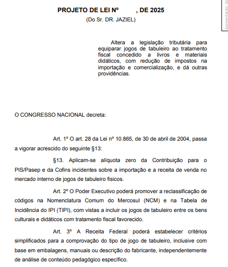 O Projeto de Lei nº 2.341/25 propõe a redução de impostos sobre jogos de tabuleiro no Brasil ao equiparar esses produtos a livros e materiais didáticos para fins tributários. A medida busca incentivar o acesso e o reconhecimento dos jogos como instrumentos culturais e educacionais.