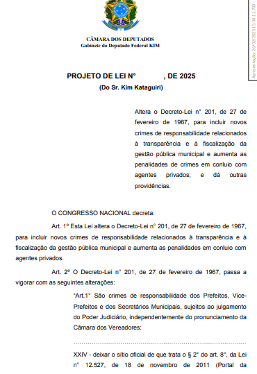 O Projeto de Lei (PL) 708/25 estabelece que a indisponibilidade, a desatualização ou a ausência de informações no Portal da Transparência dos municípios passe a ser considerada crime de responsabilidade de prefeitos e secretários municipais. Em análise na Câmara dos Deputados, a proposta altera o decreto-lei que define a responsabilidade de prefeitos e vereadores, o Decreto-lei 201/67.