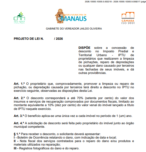 Um projeto de lei em tramitação na Câmara Municipal de Manaus (CMM) propõe conceder desconto no Imposto Predial e Territorial Urbano (IPTU) para proprietários de imóveis que realizarem a limpeza de pichações ou reparos em danos provocados por terceiros. A proposta é de autoria do vereador Jaildo Oliveira (PV) e estabelece que o benefício será aplicado no exercício seguinte ao da realização do serviço.