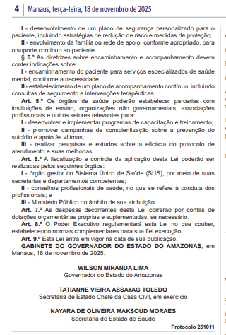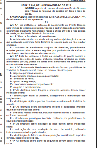 As unidades de pronto atendimento do Amazonas passam a seguir um protocolo padronizado para o acolhimento de vítimas de tentativa de suicídio. A determinação está prevista na Lei nº 7.896/2025, já sancionada e publicada no Diário Oficial do Estado do Amazonas (DOE). A nova legislação torna obrigatório que hospitais, prontos-socorros, UPAs e postos de saúde com serviço emergencial adotem diretrizes unificadas para garantir um cuidado humanizado, rápido e eficaz às vítimas.