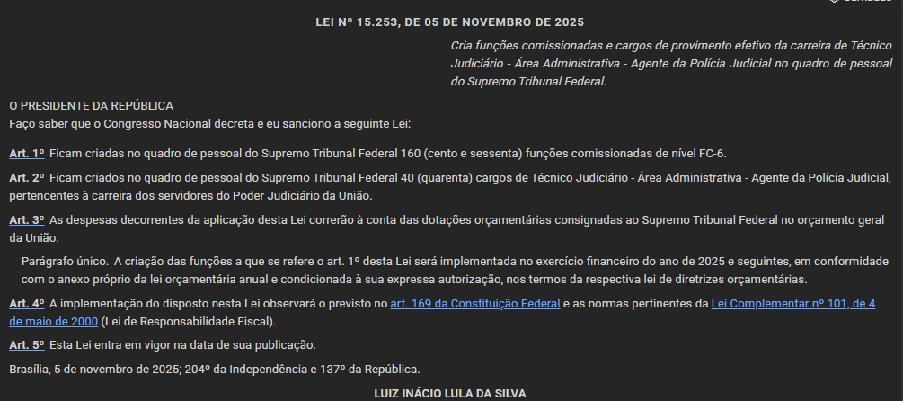 O presidente Luiz Inácio Lula da Silva sancionou a Lei 15.253, que amplia o quadro de pessoal e cria novas funções comissionadas no Supremo Tribunal Federal (STF). A norma foi publicada nesta quinta-feira (6/11) no Diário Oficial da União e prevê 160 novas funções comissionadas de nível FC-6, destinadas aos gabinetes dos ministros, além da criação de 40 cargos de técnico judiciário, agente da Polícia Judicial.