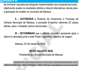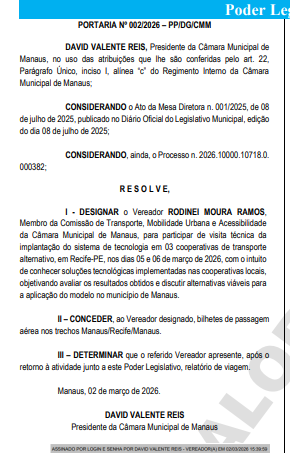 O presidente da Câmara Municipal de Manaus (CMM), David Valente Reis, publicou duas portarias no Diário Oficial do Legislativo Municipal designando o vereador Rodinei Moura Ramos, ambos do partido Avante, para participar de uma visita técnica em Recife, Pernambuco, nos dias 5 e 6 de março de 2026.