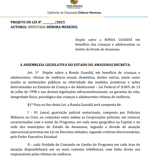 O programa “Ronda Guardiã”, voltado à proteção de crianças e adolescentes vítimas de violência sexual, doméstica ou outras formas de agressão, de autoria da deputada estadual Débora Menezes (PL), foi aprovado na Assembleia Legislativa do Amazonas (Aleam), nesta quinta-feira (16/10).