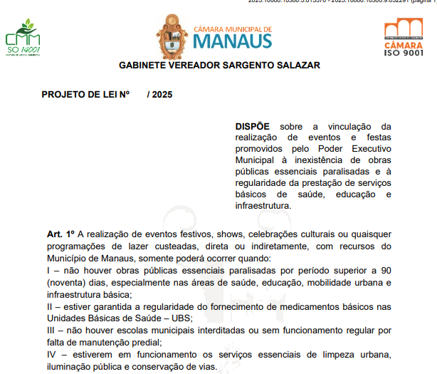 Protocolado na Câmara Municipal de Manaus (CMM), um projeto de lei do vereador Sargento Salazar (PL), segue tramitando na Casa Legislativa, intitulado “Festa Só com Dever de Casa Feito”, estabelece critérios rigorosos para a realização de eventos festivos custeados, direta ou indiretamente, com recursos do Município.