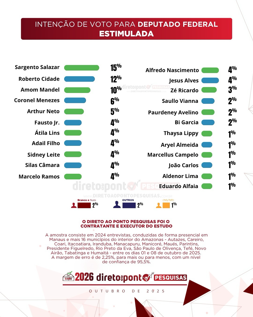O levantamento ouviu 2.024 eleitores em Manaus e em 16 municípios do interior, abrangendo todas as regiões do estado. Além da disputa proporcional, a pesquisa também avaliou cenários para o Senado e a percepção ideológica do eleitor amazonense.