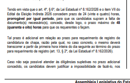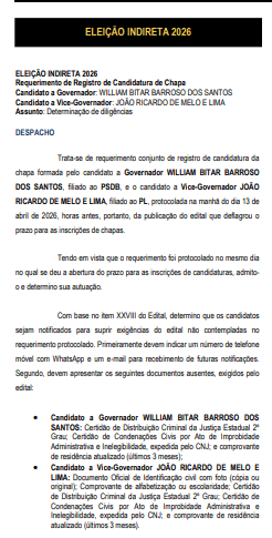 Diante das inconsistências, foi determinado que os candidatos sejam notificados para complementar a documentação no prazo máximo de 48 horas. O período está previsto na Lei Estadual nº 8.162/2026, que rege o processo eleitoral indireto no Estado e permite a regularização de pendências dentro de um prazo adicional.