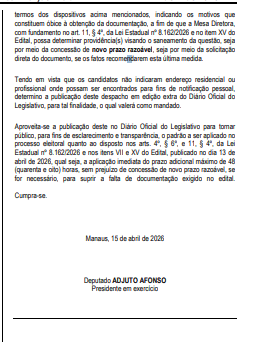 Sem a indicação de endereço físico para notificação pessoal, a decisão determinou ainda a publicação do despacho no Diário Oficial do Legislativo, que passa a valer como meio oficial de comunicação com os candidatos.