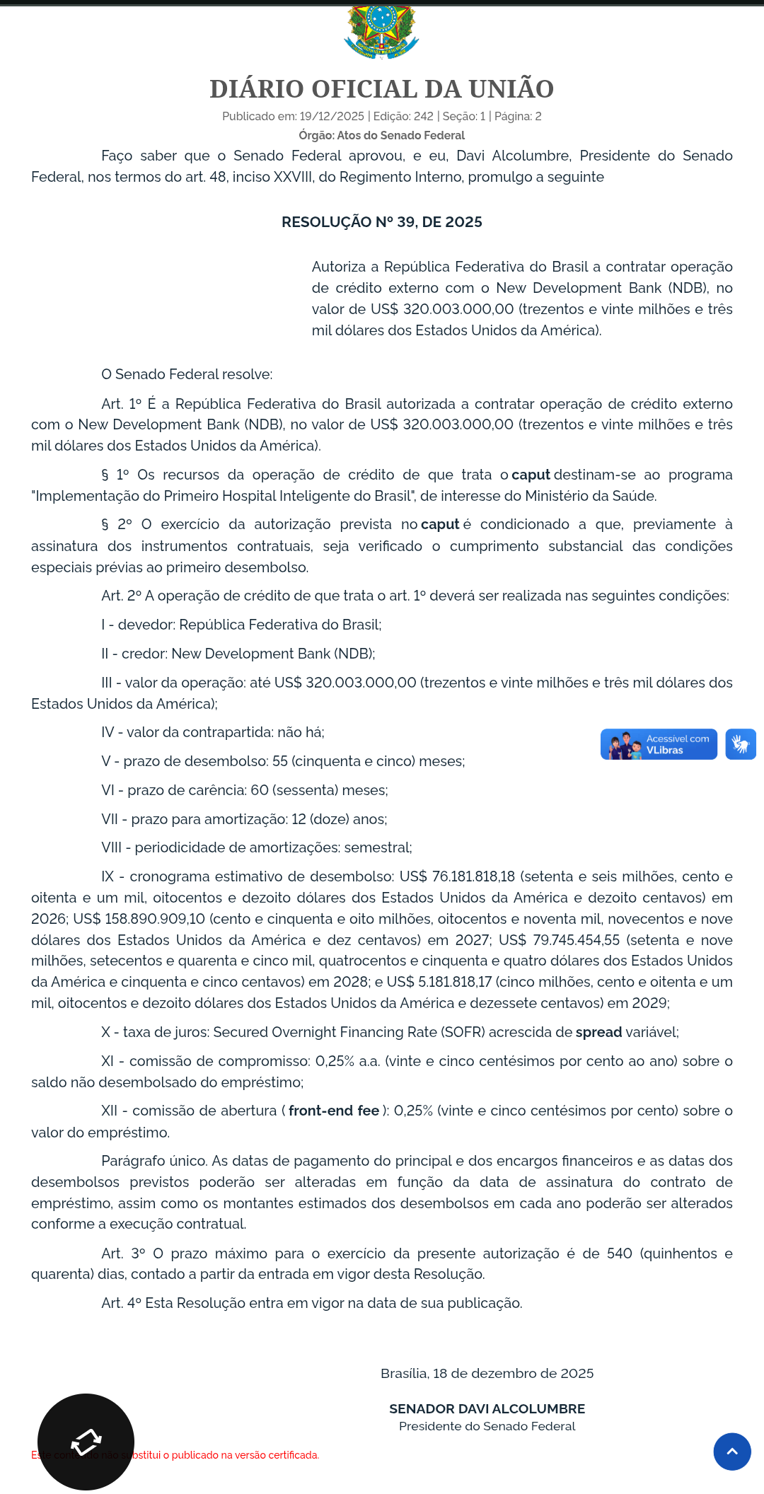 O Plenário do Senado aprovou nesta terça-feira (16/12) mensagem do Executivo que autoriza a contratação de empréstimo externo de cerca de US$ 320 milhões, aproximadamente R$ 1,7 bilhão, para a criação do primeiro “hospital inteligente” do país (MSF 86/2025). A mensagem foi aprovada na forma de projeto de resolução (PRS 65/2025) e foi publicada no Diário Oficial (DOU).