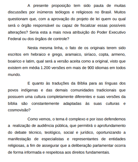 No documento, Damares destaca a complexidade do tema e levanta questões sobre a fiscalização de possíveis alterações, a definição de qual versão seria considerada original — já que a Bíblia foi escrita em outras línguas e posteriormente traduzida — e os desafios para versões em idiomas indígenas e de comunidades tradicionais.