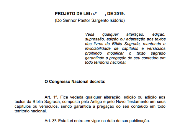 A Comissão de Educação e Cultura (CE) do Senado realiza, nesta quinta-feira (30/10), uma audiência pública para discutir o Projeto de Lei 4.606/2019, que proíbe alterações, adaptações, edições, supressões ou adições em livros publicados com o título Bíblia Sagrada. O debate está marcado para as 14h30 (de Brasília).