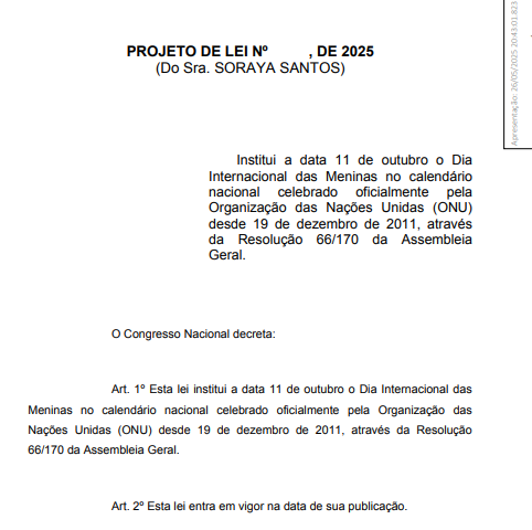 Segundo o texto do PL 2.562/2025, o Dia Internacional das Meninas foi instituído pela ONU em 19 de dezembro de 2011, por meio da Resolução 66/170 da Assembleia Geral, com o objetivo de promover a igualdade de gênero e o empoderamento das meninas. A proposta brasileira busca incluir oficialmente essa data no calendário nacional.