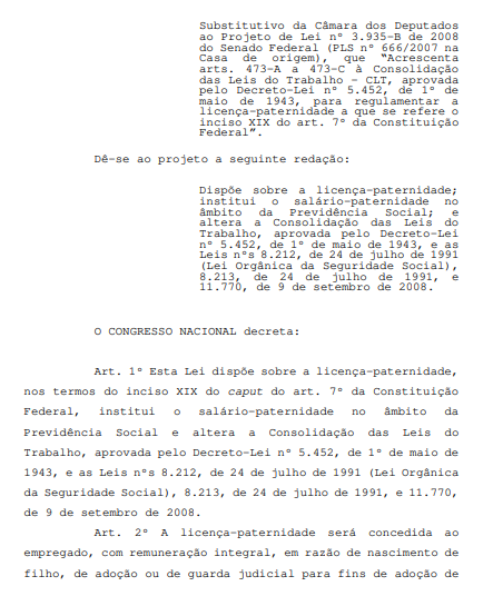 A relatoria da matéria no Senado ficou a cargo da senadora Ana Paula Lobato, do (PDT-MA) Conforme o cronograma estabelecido no projeto, a ampliação da licença será feita de forma gradual: 10 dias nos dois primeiros anos de vigência da lei, 15 dias no terceiro ano e 20 dias a partir do quarto ano, condicionada ao cumprimento das metas fiscais previstas na legislação orçamentária.