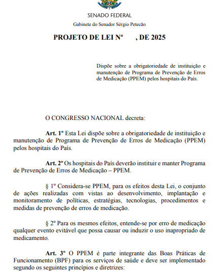 Na justificativa, o senador destaca a gravidade do problema. Petecão ressalta que as falhas podem ocorrer em qualquer etapa do processo, desde a prescrição até a administração do medicamento, muitas vezes ligadas à pressa, fadiga, falhas de comunicação entre equipes e ausência de programas institucionais estruturados.
