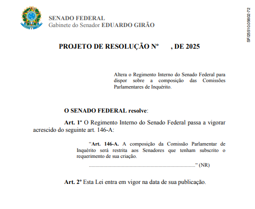 O senador Eduardo Girão (Novo-CE) apresentou no Senado o Projeto de Resolução (PRS) 48/2025, que altera as regras de criação e composição das Comissões Parlamentares de Inquérito (CPIs). A proposta determina que somente os parlamentares que assinarem o requerimento de criação da CPI possam integrá-la, garantindo, segundo ele, mais legitimidade às investigações.