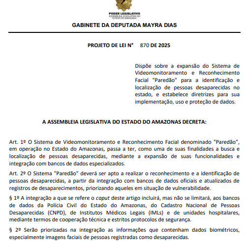 O sistema de videomonitoramento e reconhecimento facial “Paredão” pode ampliar suas funções durante sua operação no Amazonas, servindo também na busca e localização de pessoas desaparecidas, por meio da integração com bancos de dados oficiais e especializados. A sugestão é da deputada estadual Mayra Dias (Avante).