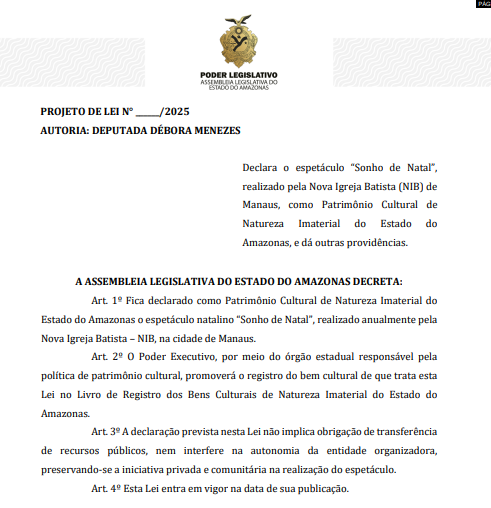 O projeto de lei da deputada estadual Débora Menezes (PL) que declara o espetáculo natalino “Sonho de Natal”, realizado anualmente pela Nova Igreja Batista (NIB), como Patrimônio Cultural de Natureza Imaterial do Estado, está em tramitação na Assembleia Legislativa do Amazonas (Aleam). A proposta reconhece oficialmente a relevância cultural de uma das apresentações mais tradicionais e populares do fim de ano em Manaus.