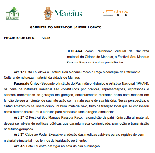 A Câmara Municipal de Manaus (CMM) recebeu um Projeto de Lei (PL) que propõe reconhecer o Festival Sou Manaus Passo a Paço como Patrimônio Cultural de natureza Imaterial da cidade de Manaus. A proposta é de autoria do vereador Jander Lobato (PSD) que, em sua justificativa, ressalta o impacto econômico e social do evento.