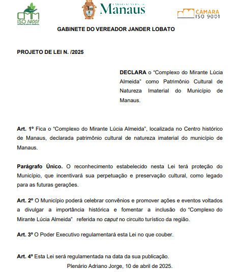 Essa não é a única proposta do parlamentar para transformar algo em Patrimônio Cultural Imaterial de Manaus. Em abril deste ano, o vereador sugeriu que o Complexo do Mirante Lúcia Almeida, no Centro Histórico da capital amazonense, também fosse contemplado.