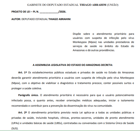 Um projeto de lei em tramitação na Assembleia Legislativa do Amazonas (Aleam), de autoria do deputado estadual Thiago Abrahim (União Brasil), propõe garantir atendimento prioritário a pacientes com suspeita de infecção por Mpox, conhecida como varíola dos macacos, em unidades de saúde públicas e privadas do estado.