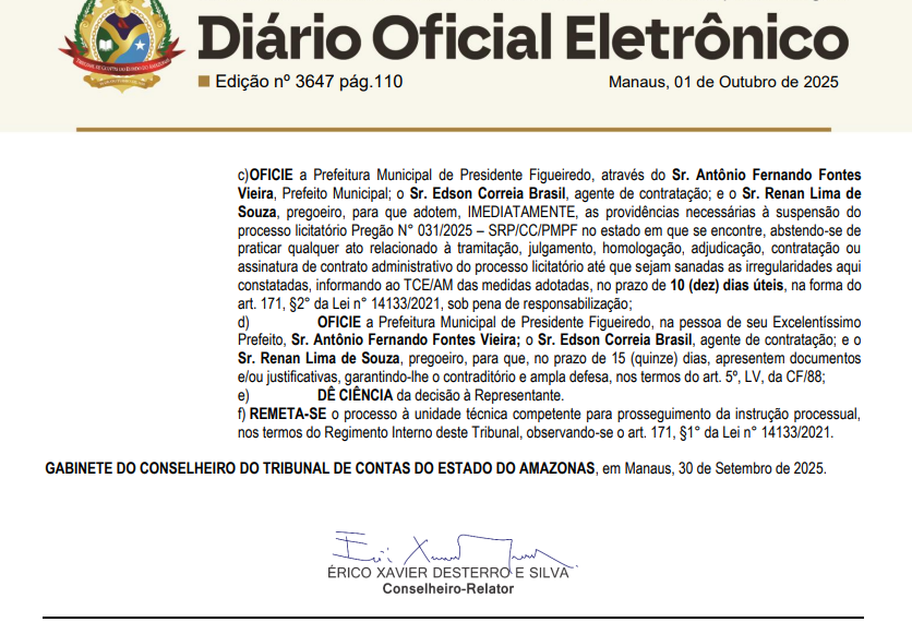 O Tribunal de Contas do Estado do Amazonas (TCE-AM) determinou a suspensão imediata do Pregão Eletrônico n.º 031/2025 da Prefeitura de Presidente Figueiredo, a cerca de 128 km de distância de Manaus. A decisão foi tomada após representação apresentada pela empresa Mix Premium Ltda, que alegou irregularidades no processo licitatório, apontando violações aos princípios da legalidade, isonomia e competitividade.