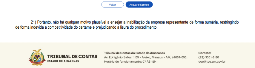 Após analisar os documentos, o conselheiro relator Érico Xavier Desterro e Silva considerou que houve excesso de formalismo e falta de clareza nas justificativas da Prefeitura para a desclassificação das empresas. Ele destacou ainda que não foram apresentadas provas objetivas que confirmassem a suposta irregularidade na apólice de seguro apresentada pela empresa denunciante.