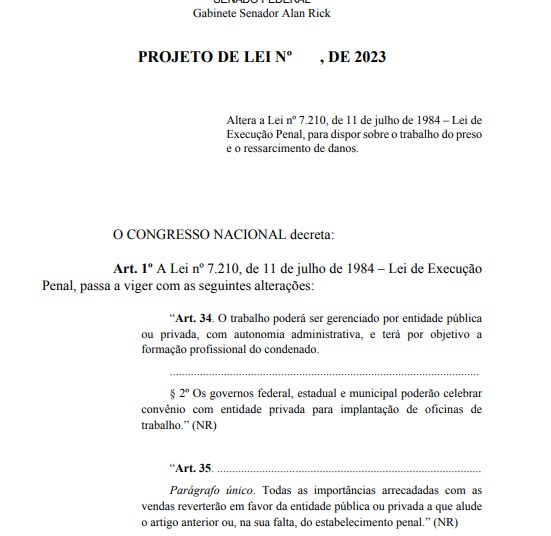Um projeto de lei em tramitação no Senado Federal autoriza que entidades privadas passem a gerenciar o trabalho e a formação profissional de pessoas privadas de liberdade no Brasil. A proposta, de autoria do senador Alan Rick (Republicanos-AC), foi aprovada na Comissão de Segurança Pública (CSP) e deve ser analisada ainda neste ano pela Comissão de Constituição e Justiça (CCJ).