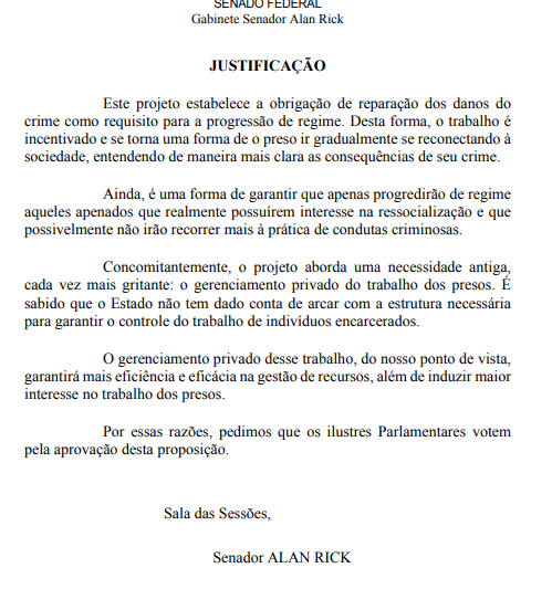 Na justificativa, o senador Alan Rick afirma que o Estado não tem conseguido garantir, sozinho, a estrutura necessária para oferecer atividades profissionais aos presos. Segundo ele, o gerenciamento privado tende a trazer mais eficiência, melhorar a gestão de recursos e estimular o interesse dos detentos pelo trabalho, fortalecendo o processo de ressocialização.