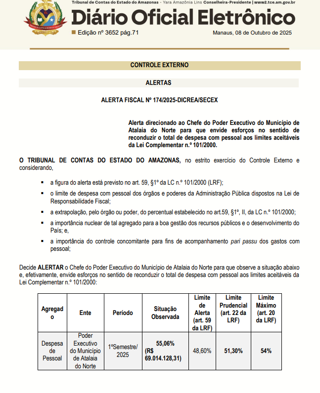 Em Atalaia do Norte, sob o comando do prefeito Denis Linder Rojas de Paiva (União Brasil), município localizado no extremo oeste do Amazonas, na tríplice fronteira entre Brasil, Colômbia e Peru, a despesa com pessoal atingiu 55,06% da receita corrente líquida no primeiro semestre de 2025, ultrapassando o limite máximo de 54% permitido pela LRF. Com pouco mais de 20 mil habitantes, a cidade enfrenta desafios de gestão e infraestrutura típicos da região do Alto Solimões e depende fortemente de repasses federais para manter suas contas em dia.