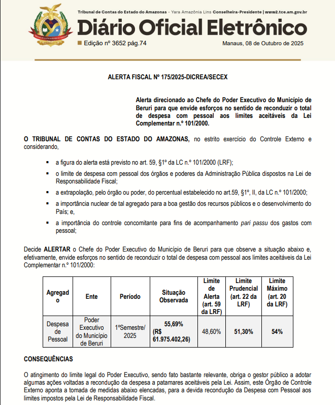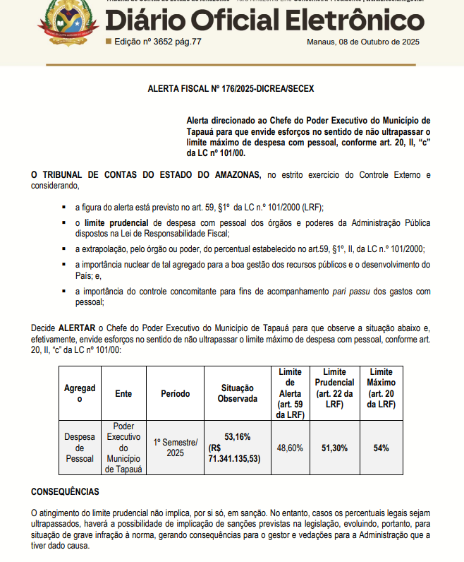 O Tribunal de Contas do Estado do Amazonas (TCE-AM) emitiu alertas fiscais, publicados no Diário Oficial do órgão desta quarta-feira (8/10), aos prefeitos de Tapauá, Beruri e Atalaia do Norte, por ultrapassarem ou se aproximarem do limite máximo de despesas com pessoal estabelecido pela Lei de Responsabilidade Fiscal (LRF).
