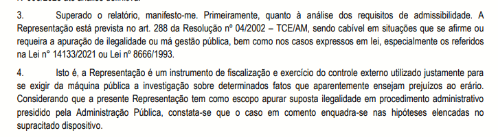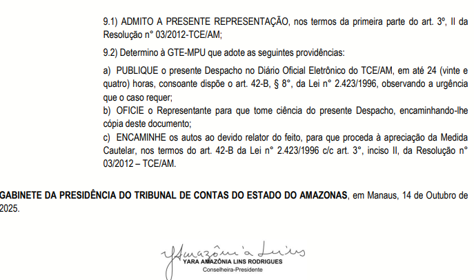 De acordo com o Despacho nº 1632/2025-GP, o presidente do TCE-AM decidiu admitir a representação, reconhecendo que o pedido cumpre os requisitos legais previstos no art. 288 da Resolução nº 04/2002 do Tribunal. A decisão também determina a remessa dos autos ao relator para análise do pedido de medida cautelar, que solicita a suspensão imediata da homologação e adjudicação do pregão até a conclusão da investigação.