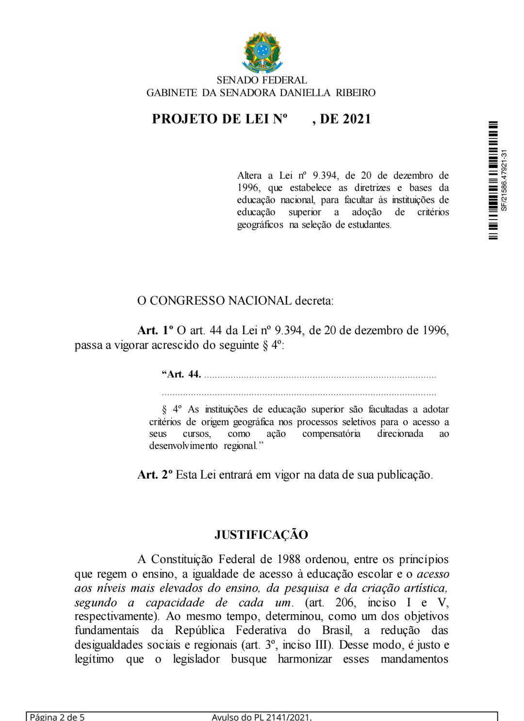 De autoria da senadora Daniella Ribeiro (União-TO), o texto acrescenta um parágrafo ao artigo 44 da Lei nº 9.394, de 1996, para permitir que universidades e faculdades utilizem a procedência dos candidatos como critério adicional de seleção. A proposta define a iniciativa como uma ação compensatória voltada à redução de desigualdades regionais no acesso ao ensino superior.