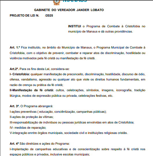Um projeto de lei em tramitação na Câmara Municipal de Manaus (CMM) propõe a criação de uma política específica de combate à cristofobia na capital amazonense. De autoria do vereador Jander Lobato (PSD), a proposta institui o Programa Municipal de Combate à Cristofobia, com foco na prevenção, enfrentamento e reparação de atos de intolerância contra a fé cristã.