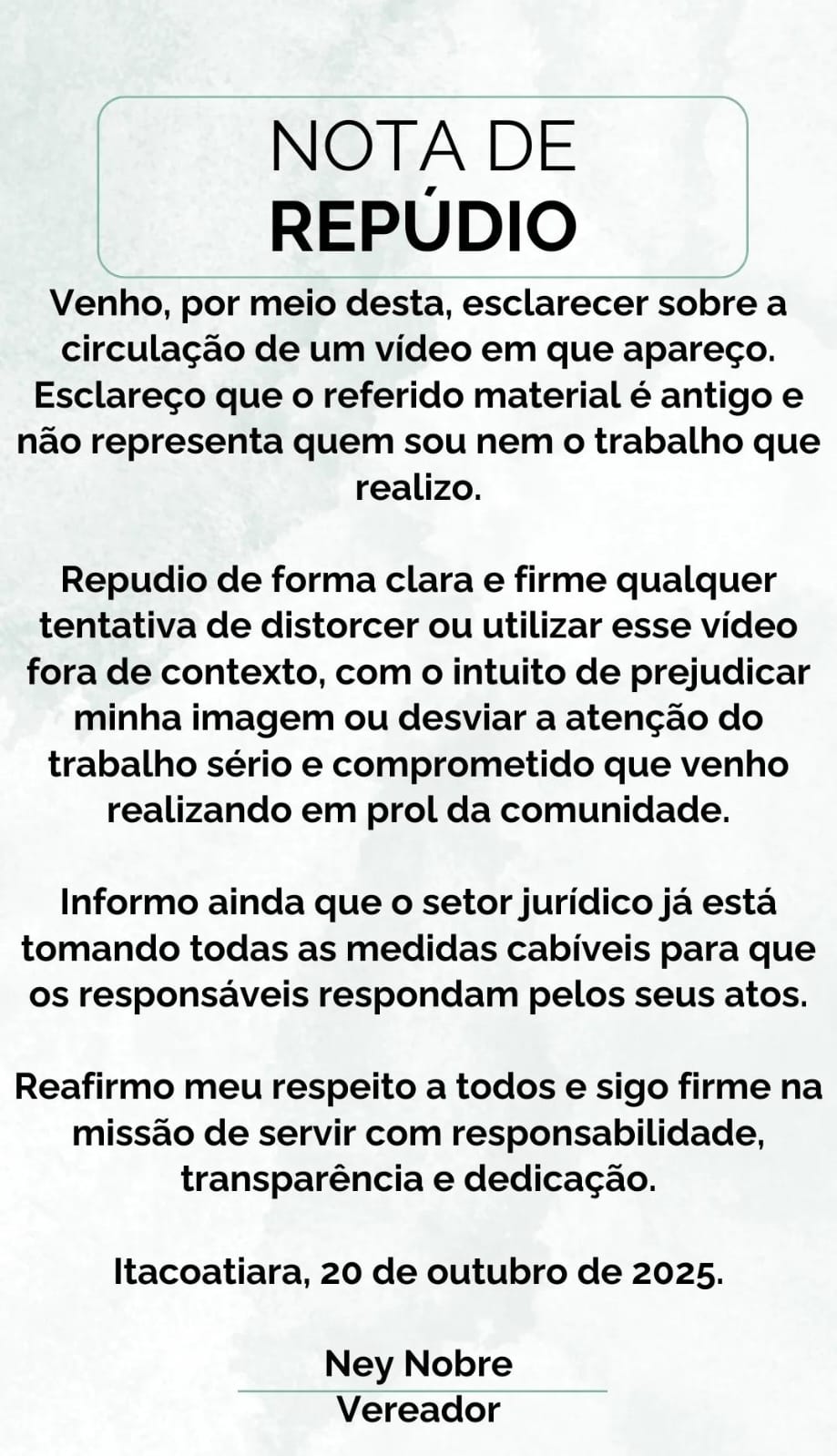 “Repudio de forma clara e firme qualquer tentativa de distorcer ou utilizar esse vídeo fora de contexto, com o intuito de prejudicar minha imagem ou desviar a atenção do trabalho sério e comprometido que venho realizando em prol da comunidade”, declarou.