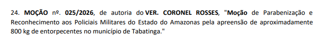 A Câmara Municipal de Manaus (CMM) analisa a Moção nº 025/2026, de autoria do vereador Coronel Rosses (PL), que concede Parabenização e Reconhecimento aos policiais militares do Estado do Amazonas pela apreensão de aproximadamente 800 quilos de entorpecentes no município de Tabatinga.