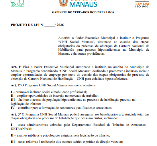 A proposta tem como principal objetivo ampliar as oportunidades de emprego na capital amazonense, considerando que a habilitação é um requisito essencial em diversas áreas, como transporte, entregas e serviços. Na justificativa, o vereador destaca que o custo elevado da CNH ainda é uma barreira para a população de baixa renda e que a iniciativa busca transformar esse cenário, promovendo inclusão produtiva e geração de renda.