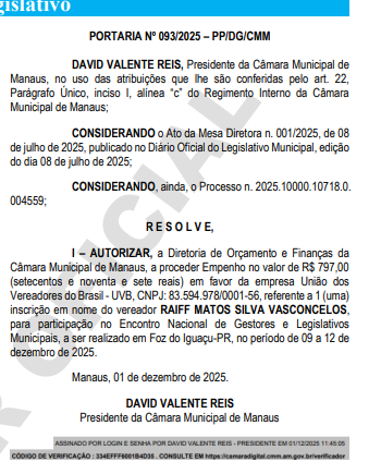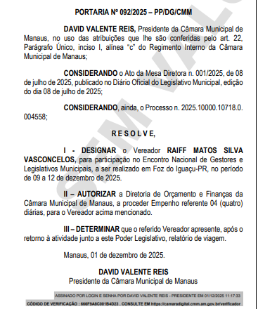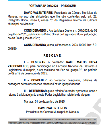 O primeiro a ser confirmado, foi a ida de Raiff Matos. Na PORTARIA Nº 091/2025, publicada em 1º de dezembro, concedeu a Raiff os bilhetes de passagem aérea nos trechos Manaus/Foz do Iguaçu/Manaus.