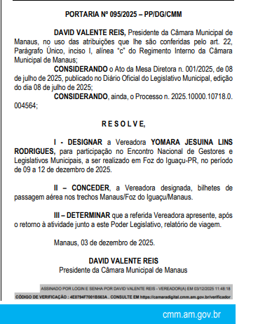 Na PORTARIA Nº 095/2025, a Casa concedeu bilhetes de passagem aérea nos trechos Manaus/Foz do Iguaçu/Manaus.