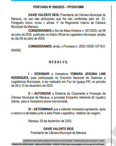 Já na PORTARIA Nº 096/2025, autoriza a Diretoria de Orçamento e Finanças da Câmara Municipal de Manaus, a proceder Empenho referente 04 (quatro) diárias para a parlamentar.