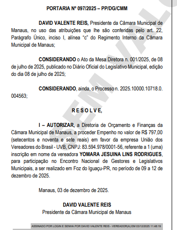 Já na PORTARIA Nº 092/2025, autorizou a Diretoria de Orçamento e Finanças da Câmara Municipal de Manaus, a proceder Empenho referente 04 (quatro) diárias, para o parlamentar.