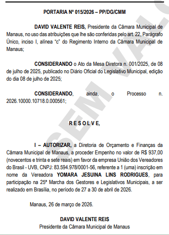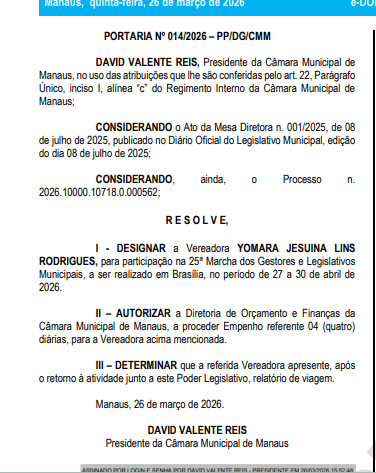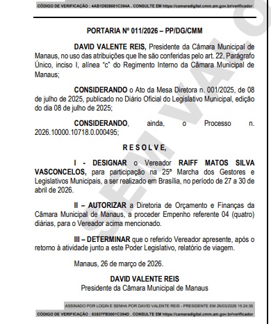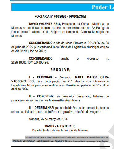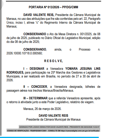 De acordo com os atos, os vereadores Raiff Matos Silva Vasconcelos e Yomara Jesuína Lins Rodrigues foram designados para participar da 25ª Marcha dos Gestores e Legislativos Municipais, que ocorrerá entre os dias 27 e 30 de abril de 2026, na capital federal.