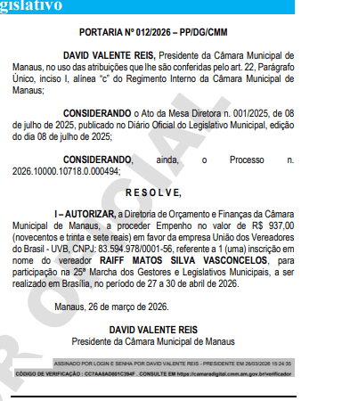 A Câmara Municipal de Manaus (CMM) autorizou a participação de vereadores da capital em uma agenda de quatro dias em Brasília, com despesas custeadas pelo Legislativo municipal. As medidas foram oficializadas por meio de portarias assinadas pelo presidente da Casa, David Valente Reis (Avante).