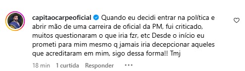 A repercussão chegou também aos comentários da publicação da Rede Onda Digital no Instagram. O vereador Capitão Carpê (PL) disse que entrou na política com o compromisso de não decepcionar seus eleitores e reforçou sua posição contrária à reforma.