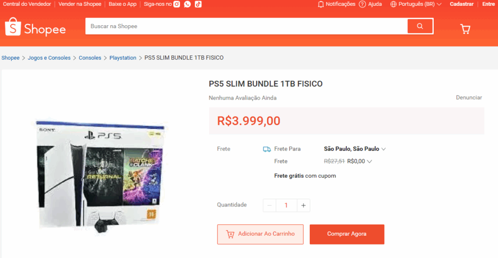 Um dos produtos anunciados é um videogame PlayStation 5 por R$ 2,019 mil, enquanto no site da Shopee o mesmo produto está saindo a R$ 3.999. O consumidor também é pressionado por contagens regressivas e mensagens como “últimas unidades”, estratégia usada para acelerar a compra