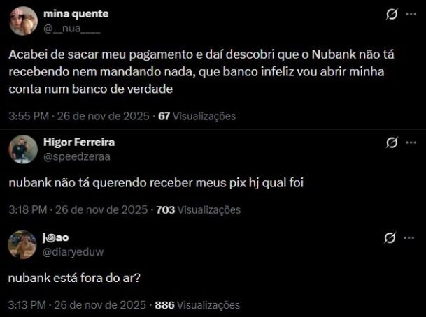 Nas redes sociais, usuários afirmaram que o app apresentava erros e que transferências estavam sendo rejeitadas sem explicação. “Acabei de sacar meu pagamento e daí descobri que o Nubank não tá recebendo nem mandando nada, que banco infeliz vou abrir minha conta num banco de verdade”, publicou uma usuária.