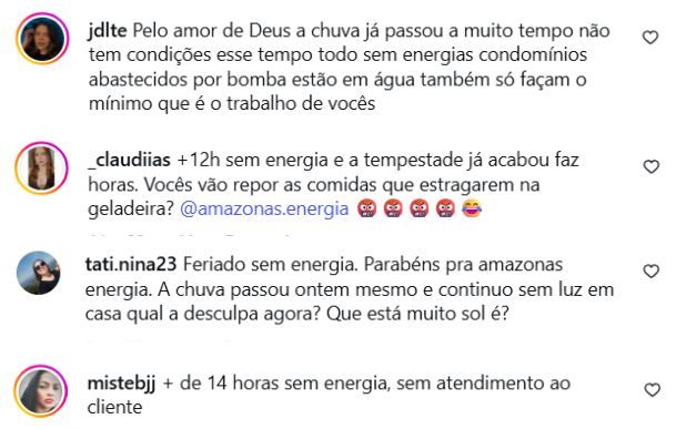 “+12h sem energia e a tempestade já acabou faz horas. Vocês vão repor as comidas que estragarem na geladeira? @amazonas.energia” perguntou outra usuária a empresa. “Que hrs vão vir ajeitar nossa energia aqui na rua buritizal colônia terra nova 2, estamos desde domingo às 19h sem energia?” questionou outra. Outra usuária disse “+ de 14 horas sem energia, sem atendimento ao cliente”.