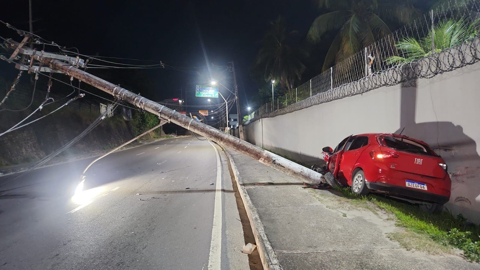 Carro derruba poste após motorista dormir ao volante na Avenida das Torres